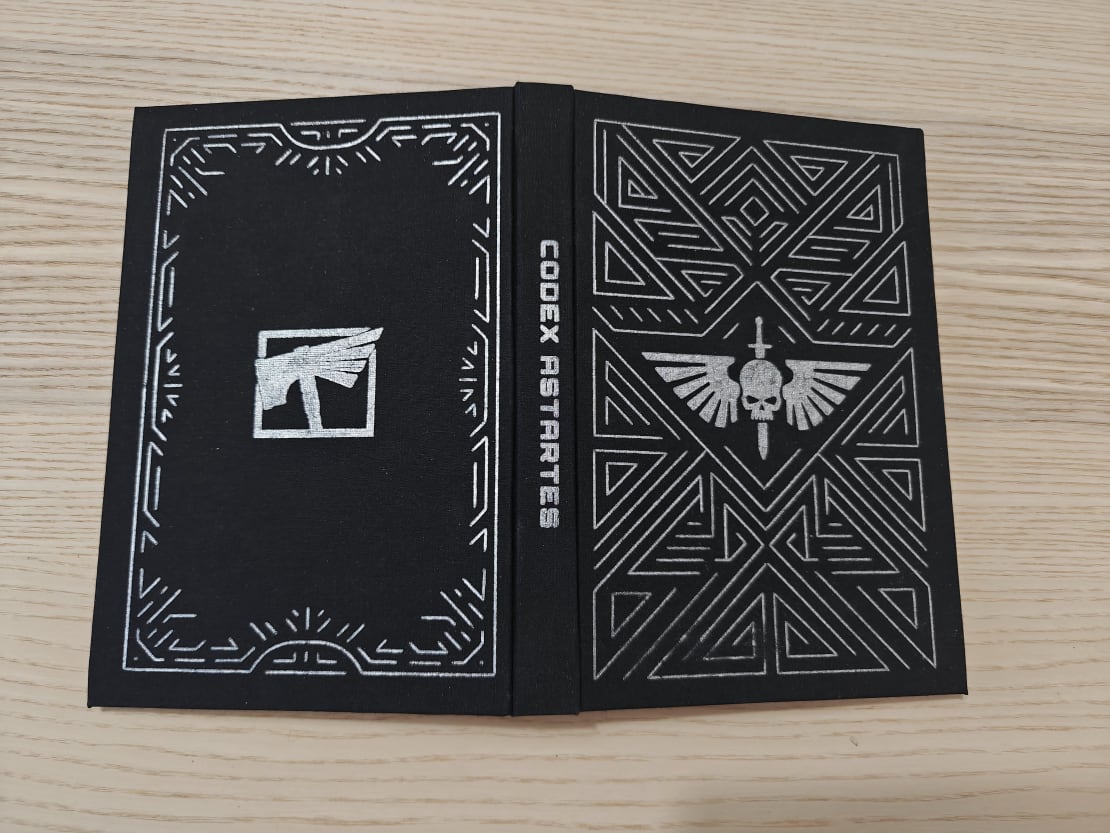 Tein kaverille syntymäpäivälahjaksi kirjan Warhammer 40K -teemalla. Kaveri on varsin aktiivinen pelaamaan ja maalaamaan figuja. Koska en itse tiedä siitä juuri mitään, kysyin puolisolta tarkempia speksejä ja hän ehdotti space marinesia. Niinpä kirjan nimeksi tuli Codex astartes ja kannessa on niiden logo. Takakannessa on yleinen Warhammer-logo.