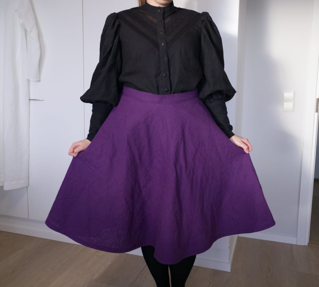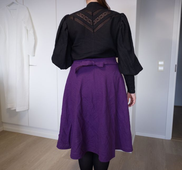 Kangas on Kankaiden yönä löydettyä Heikun Damiel-pellavaa, 260gsm. Aika näyttää oliko täyspellava täysin mahdoton hamekangas rypistymisen kannalta, mutta jos jaksaa silittää hameen ennen käyttöä, niin eiköhän sillä pärjää. Pellava on muuten niin ihana materiaali.