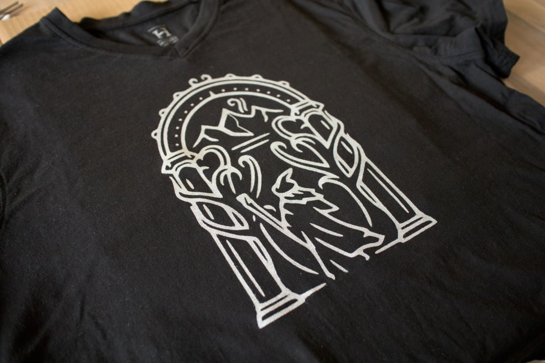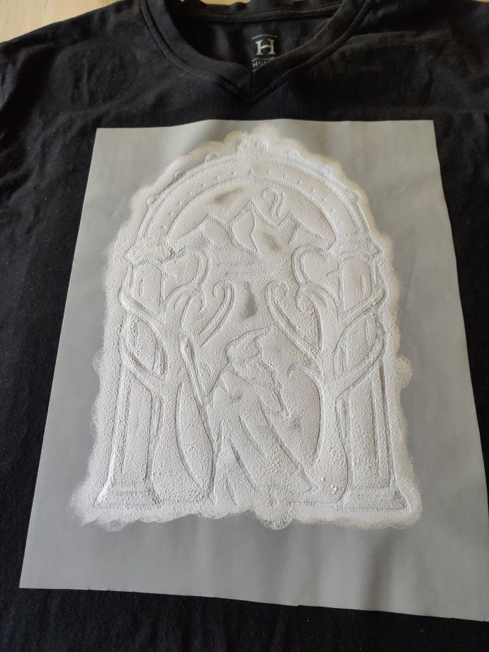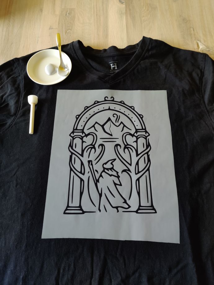 Tällä kertaa kokeilin seulan sijaan vinyylitarrasta tehtyä sapluunaa. Leikkasin Silhouette-leikkurilla kuvion, siirsin sen siirtokalvon avulla t-paidalle ja tuputtelin sienellä kangasväriä. Metodi toimii ihan siedettävästi, mutta ei vedä vertoja seulalle. Värit vähän levisivät sapluunan alle, jolloin lopputulosesta ei tule yhtä tarkkarajaista kuin seulalla. Voi olla, että vinyyli on väärä materiaali sapluunalle. Kangaskin voi vaikuttaa asiaan, kun paidat eivät ole samaa merkkiä.