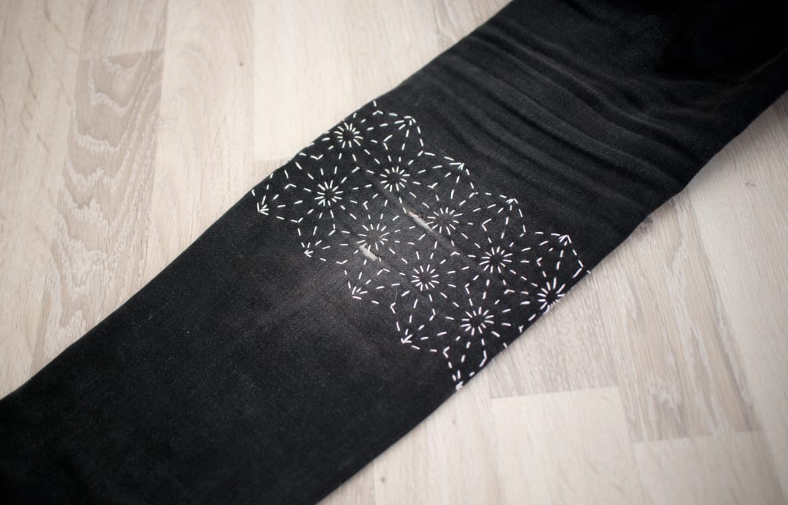 Instagramissa oli paljon hauskoja tapoja korjata reikiä vaatteissa avainsanalla #visiblemending. Päätin kokeilla itsekin tehdä näkyvän paikan sashiko-kirjonnalla kun huomasin, että farkkujen pohkeessa oli kaksi reikää. Tämä on ensimmäinen kerta, kun olen saanut housut rikki pohkeesta. Yleensä ne menevät rikki haaroista tai polvista.