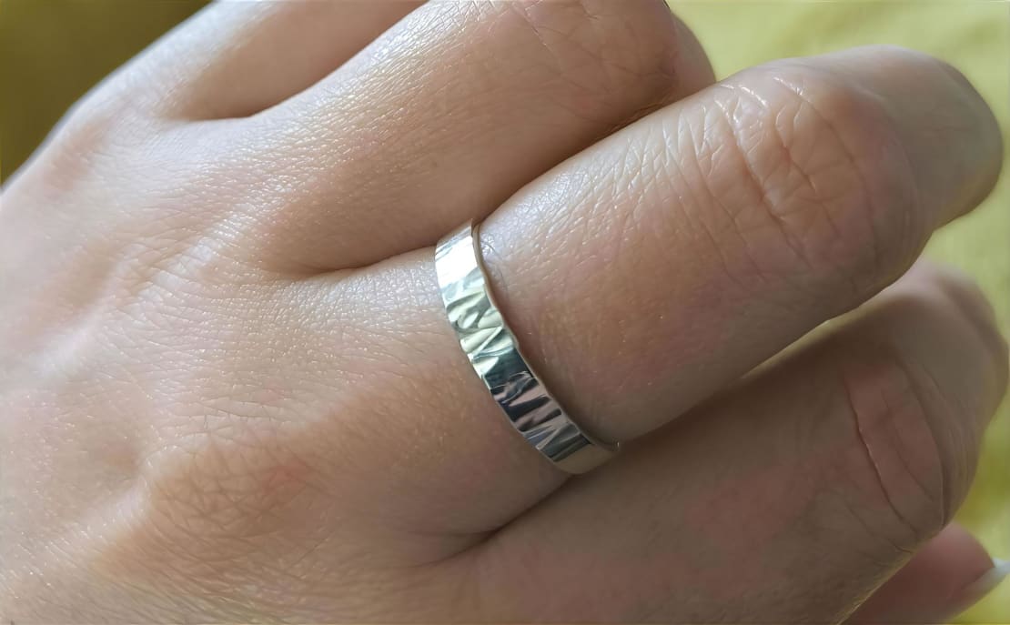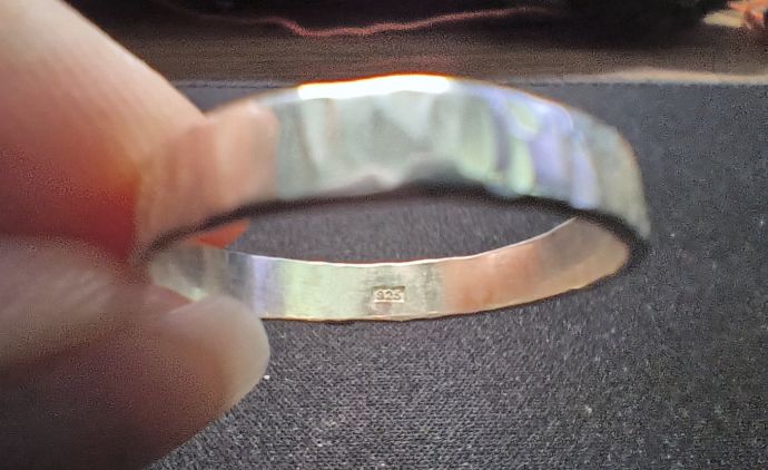 Työpaja alkoi valitsemalla mallisormuksista mieluisin, sitten mitattiin sormen koko ja sahattiin sen mittainen pala valmiista pitkulaisesta hopealevystä. Sitten hakattiin hopealeima sormuksen pinnalle punsselilla ja vasaralla. Sahatut päät hiottiin ja sitten levy taivutettiin erikoisilla pihdeillä pyöreähköksi niin, että sahatut päät kohtasivat. Tässä vaiheessa se oli ihan hassun muotoinen, mutta sillä ei ole väliä.