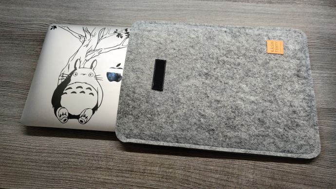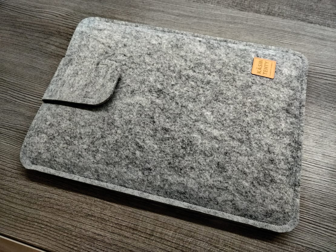 Laitoin läppärin huovan päälle ja lisäsin pari senttiä väljyyttä joka reunaan. Leikkasin sen mukaan kaksi palasta, joista toisessa on mukana läppä. Reunojen pyöreään muotoon käytin miehen viskimittaa, jossa oli juuri täydellisen kokoinen ympyrä.