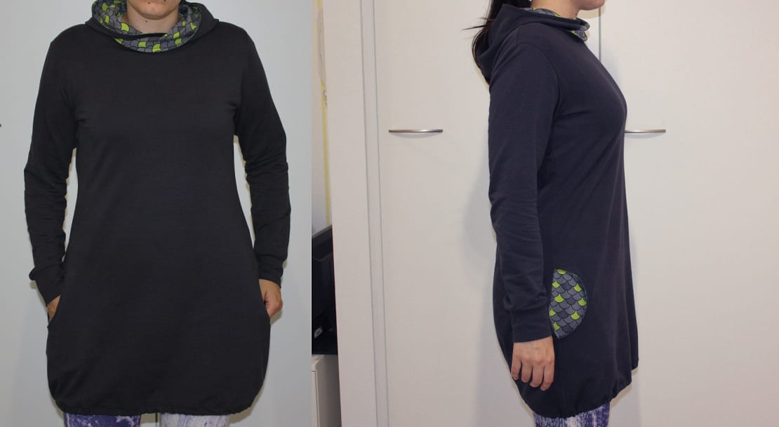 Halusin tehdä tumman yksivärisen hupparin, jota voisi pitää kuosillisten leggareiden kanssa ilman kuosiähkyä. Mutta silti siinä piti olla jokin juju. Päätin vuorittaa taskut ja hupun Jyväskylän kangaskaupan Dragon Skin -trikoolla. Tummanharmaa kangas on Kangaskapinan joustocollegea.