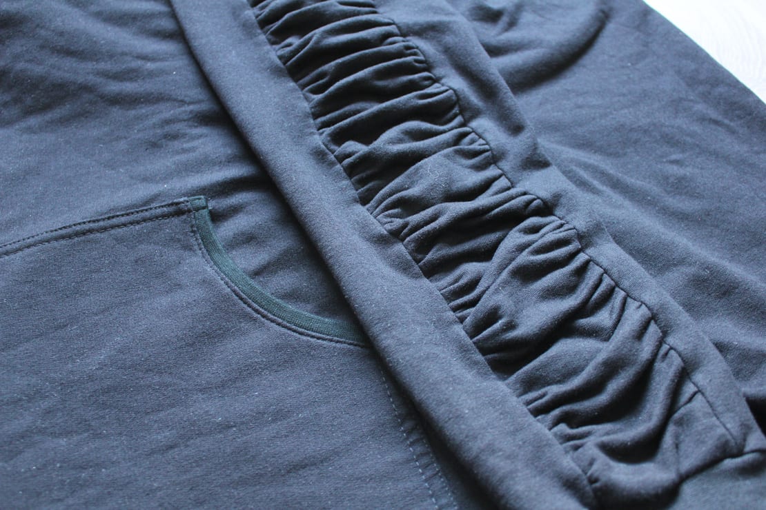 Tavallisten taskujen sijaan tein ensimmäistä kertaa kengurutaskun. Se onnistui aika hyvin. Laitoin resoria kaareviin reunoihin, muut on taitettu ja ommeltu tavalliseen tapaan. Tässäkin kyllä huomaa, että ei ole kahta samanväristä mustaa. On yllättävän vaikeaa yrittää mätsätä mustaa resoria mustaan kankaaseen.