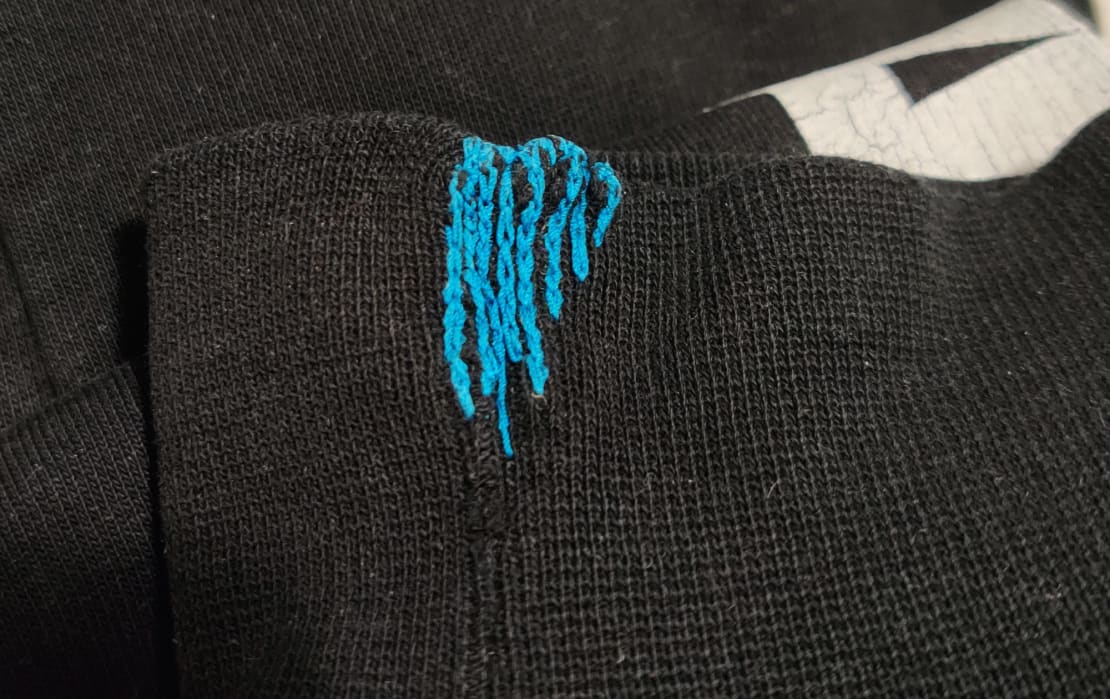 Valitsin sinisen langan ja ompelin rivin eripituisia pylväitä ketjupistolla. Siitä tuli ihan hauska väripilkku muuten mustaan huppariin.