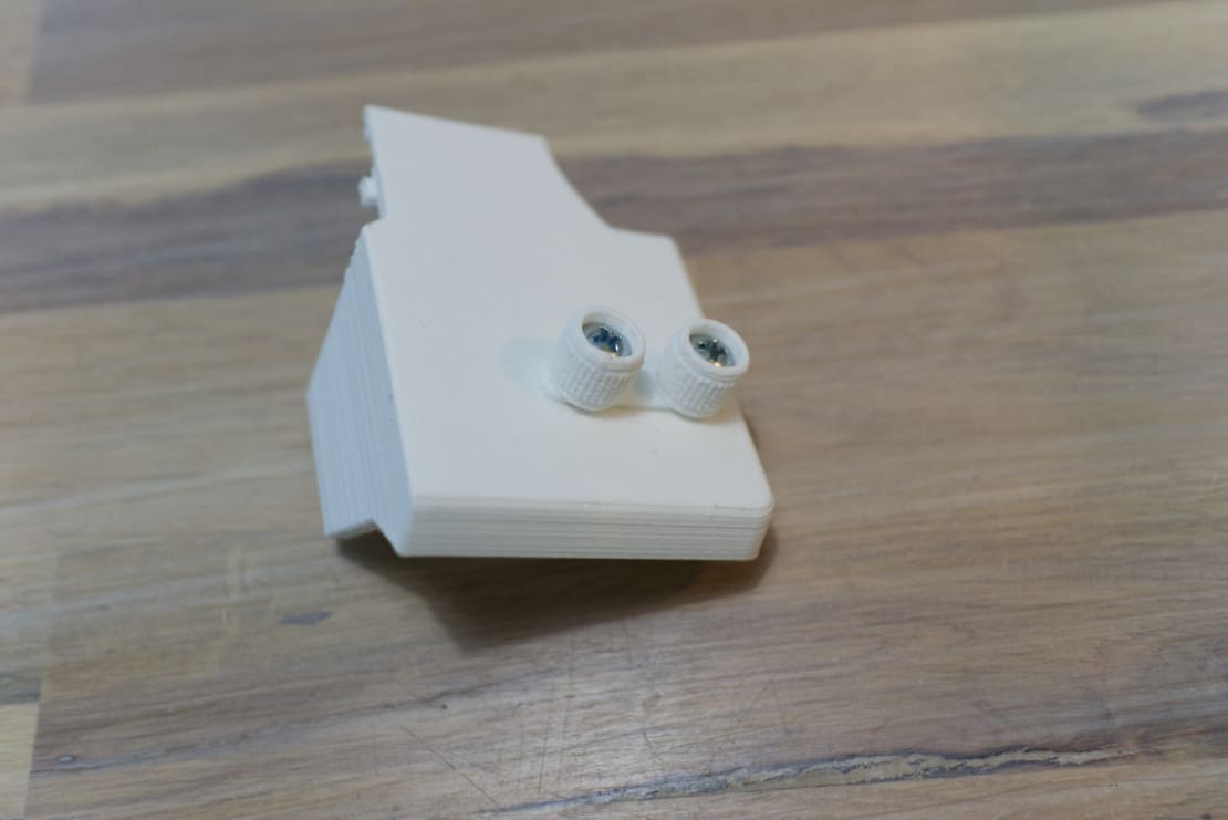 Kantinkääntäjää käyttäessä pitää ruuvata koneeseen apukiinnikkeet kantinkääntäjää varten. Ja joka kerta ne pitää säätää uudelleen. Siksi tilasin Minelleltä 3d-tulostetun kantinkääntäjän kiinnikkeen helpottamaan säätämistä.