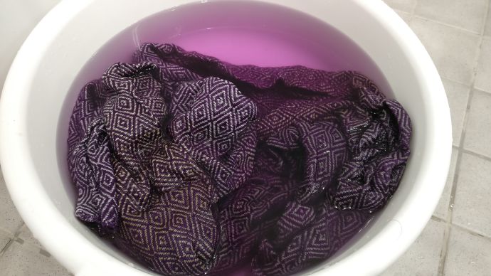 Päärmäyksen jälkeen laitoin pyyhkeen vatiin likoamaan, jotta se kutistuisi lopullisiin mittoihinsa ja päästäisi värit, jotta se ei värjäisi sitten muita pyykkejä myöhemmin pestessä. Liotuksen jälkeen laitoin pyyhkeen pesukoneeseen hellävaraiselle ohjelmalle. Pyyhkeestä lähti todella paljon kuituja, pesukoneen nukkasihti oli ihan violetin nukkamönjän peitossa.