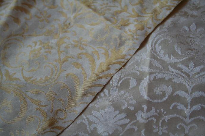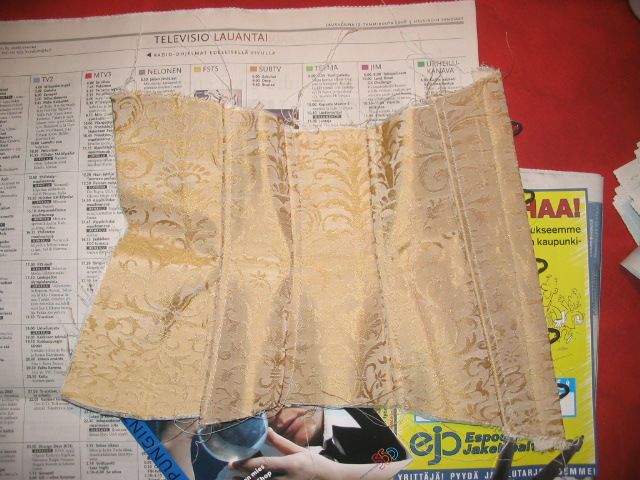 Ostin edellisen kesän Lontoon reissulta palan kultaista silkkiä. Se oli palalaarista yksi jaardin pala, joten päätin tehdä siitä underbust-korsetin. Kankaalla oli kaksi eriväristä puolta, toinen tummempi ja kultaisempi ja toinen vaaleampi. Tykkäsin molemmista paljon, mutta päädyin lopulta käyttämään kultaisempaa puolta. Sen lisäksi ostin vielä pienemmän palan kultaista dupionisilkkiä, joista tein kanttinauhan ja ulkopuoliset luukujat.