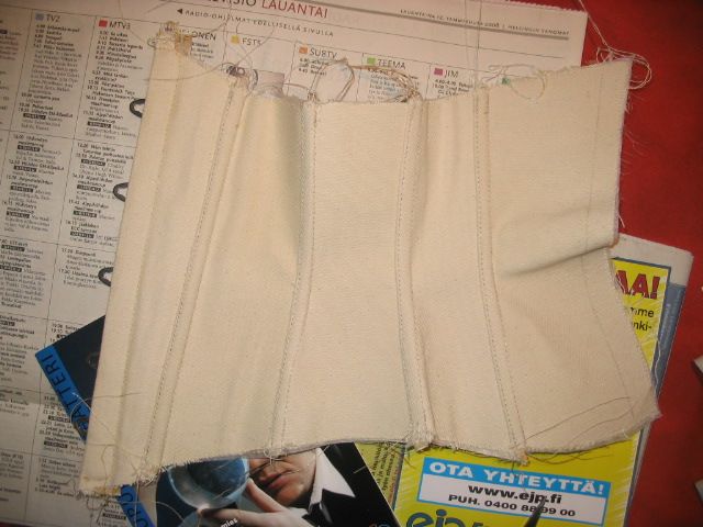 Tämä on vaikeaa, kun en tiedä suomenkielisiä termejä.. Olen opiskellut kaikki korsettiasiat englanniksi. Vahvikekankaana (Strength fabric) käytin puuvillaista cotton drilliä (vahva kangas, jossa diagonaalinen kude? Ehkä toimikas?), joka oli aivan liian paksua tähän tarkoitukseen. Minulla ei sattunut olemaan muuta.