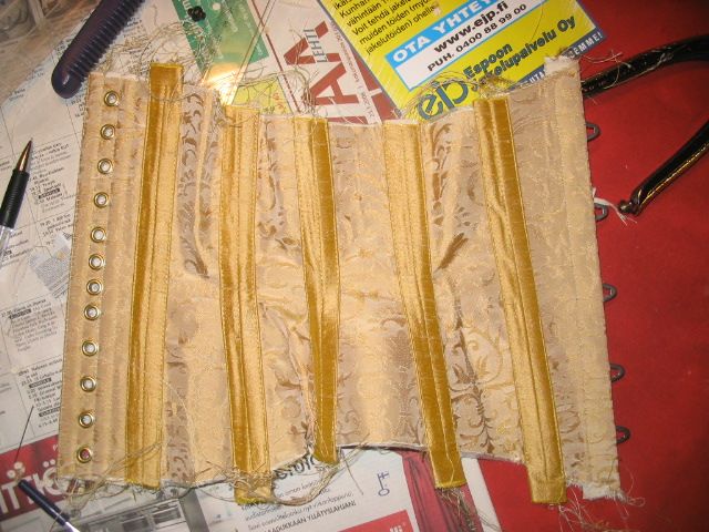 Lopuksi lisäsin kultaisen satiininauhan nyöritykseksi ja päättelin nauhan päät kultaisilla aigleteilla. Tämä oli myös ensimmäinen korsetti, johon tein plansetin alle modesty panelin.