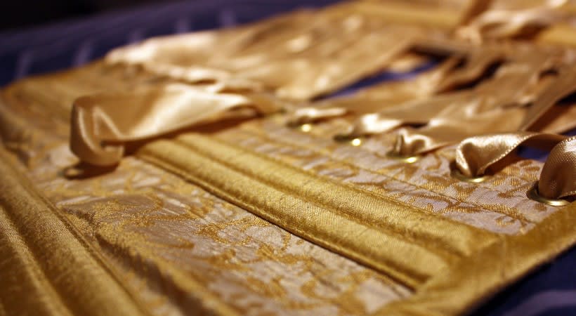 Vuoritin korsetin luonnonvalkoisella puuvillalla käyttäen floating lining -tekniikkaa. Sitten tein vinonauhaa kultaisesta silkistä. Ompelin vinonauhan koneella korsetin ulkopuolelle ja käsin sisäpuolelle. En luota oman ompelun tarkkuuteen stitch in the ditch -menetelmällä. Aiemmat kokemukseni menetelmästä on niin, että ommel menee kuitenkin jossain kohtaa vinonauhan päältä ja jossain kohtaa sen vierestä. Käsinompelulla sai tarkempaa jälkeä, vaikka se toki on työläämpääkin.