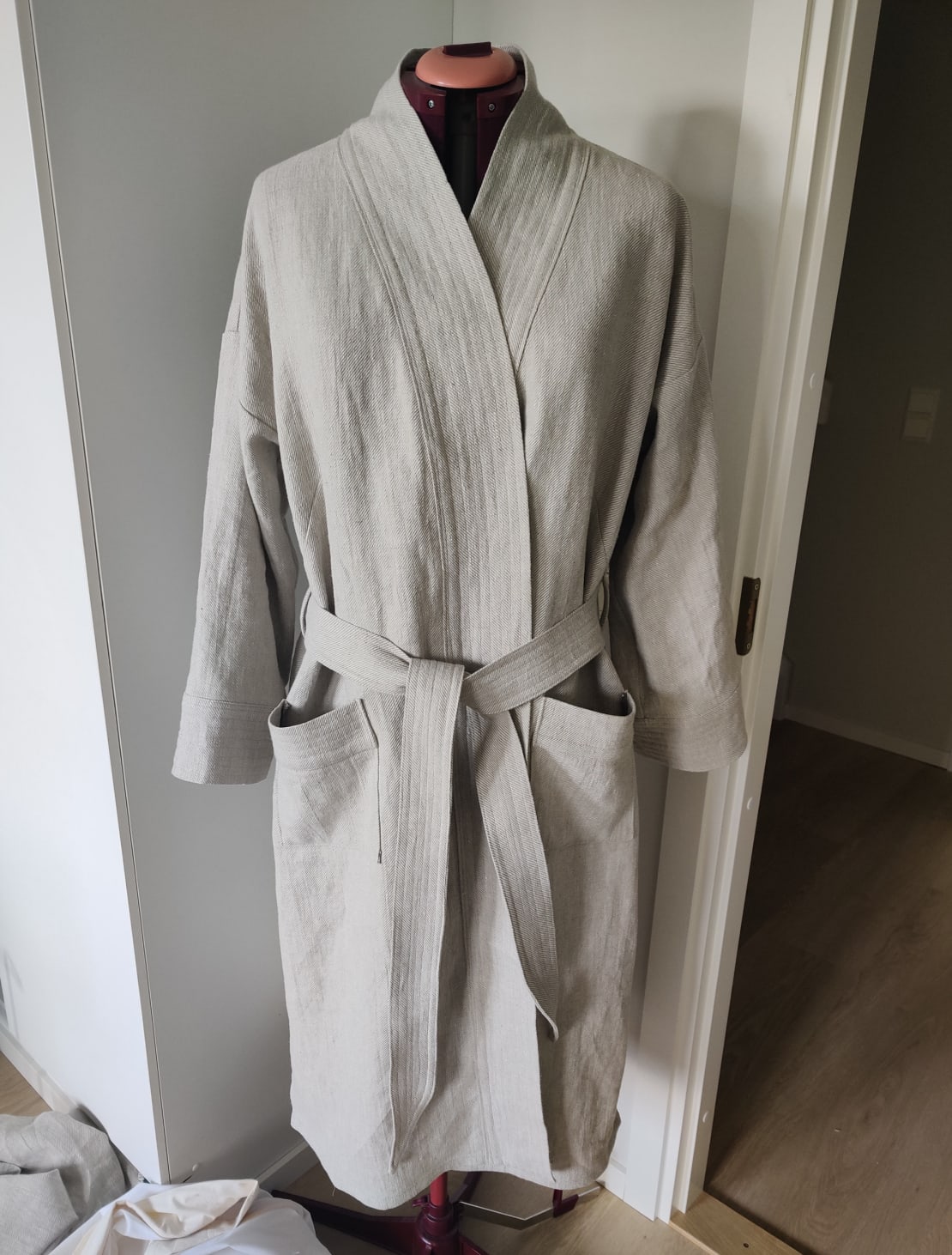 Halusin kylpytakin, jotta voin mennä saunan jälkeen terassille vilvottelemaan. Alusta asti oli selvää, että haluan tehdä sen pellavasta, koska se on tosi hyvä materiaali kylpytekstiileihin.
