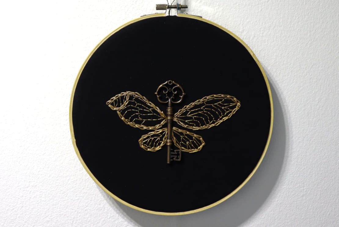 Harry Potterin lentävät avaimet inspiroivat tämän kirjontatyön. Kirjassa oven avaava avain oli vanha hopeinen sinisillä siivillä. Tässä käytin värien suhteen taiteellista vapautta.