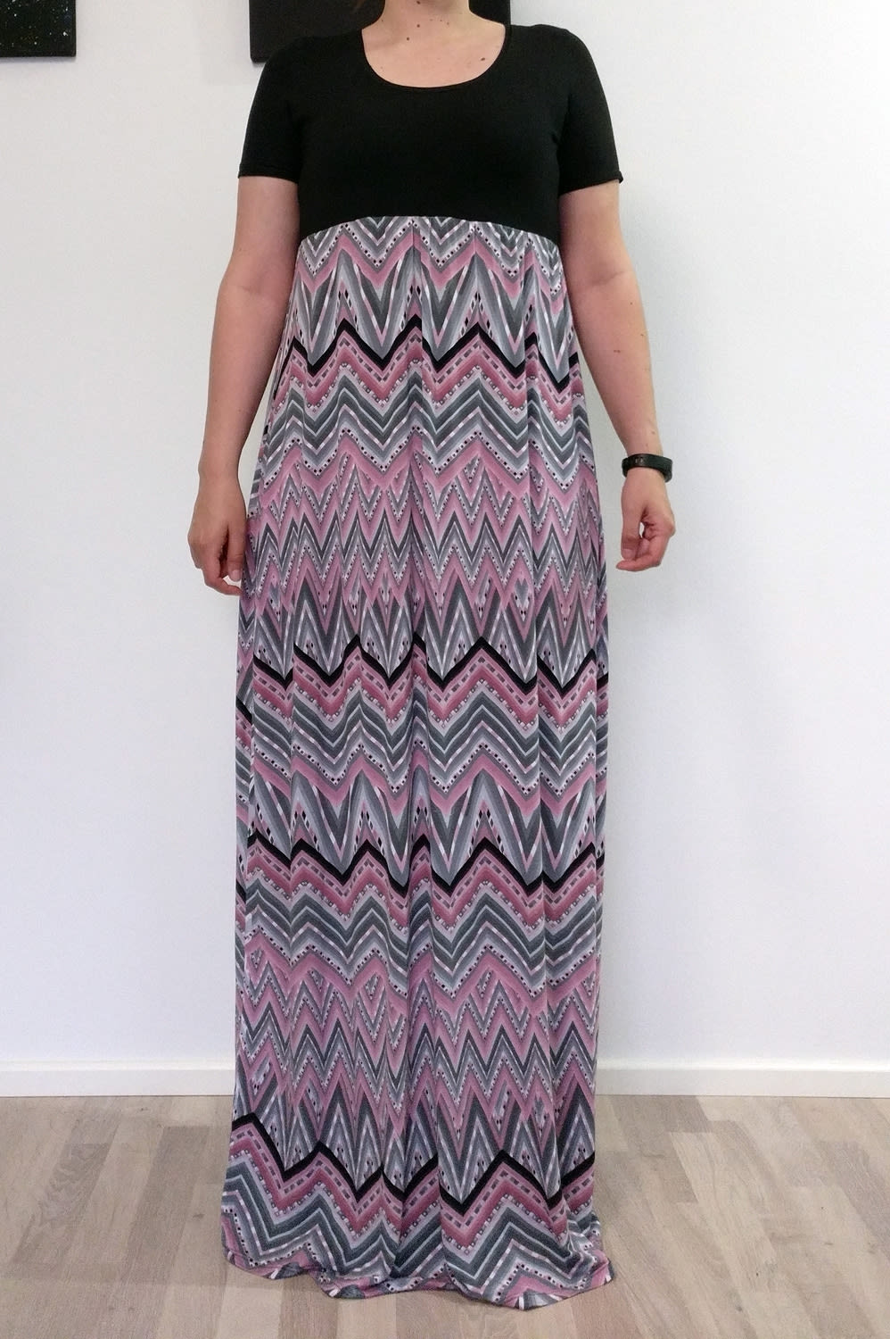 En yleensä välitä rauhattomista kuvioista tai pinkistä väristä, mutta jostain syystä tämä kiinnitti huomioni. Helman ompelin alunperin niin, että se oli pari senttiä lattiasta. Mekko on kuitenkin venynyt kaapissa, joten edessä saattaa olla uusi lyhennys.