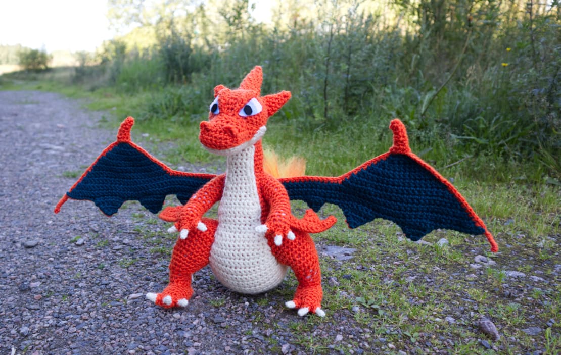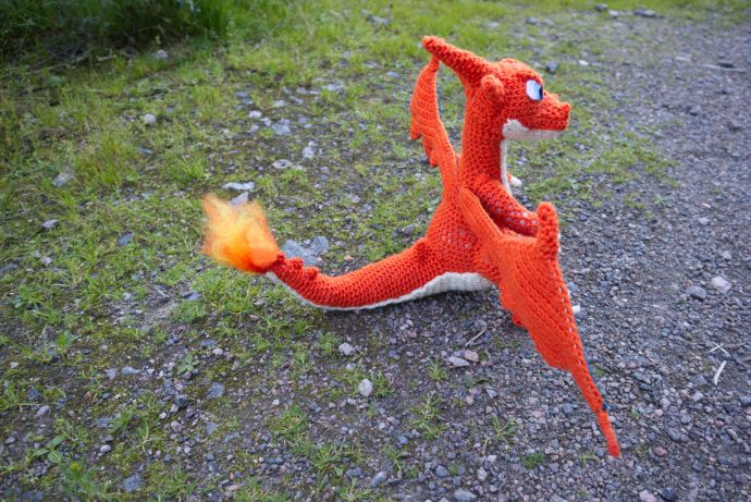 Kävin kerran Tampereella Nurja-lankakaupassa. Siellä hyllyn päällä nökötti maailman hienoin virkattu Charizard. Myyjä oli kovin ystävällinen ja jakoi linkin sen ohjeisiin. Ohje on Miahandcrafterin tekemä.