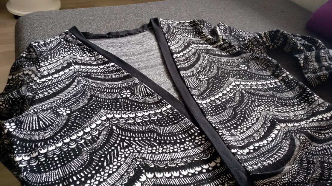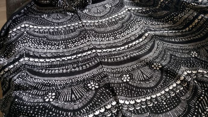 Mustan reunuksen tein resorista ja taisin alareunojen kaarteessa venyttää sitä vaikka yritin olla tekemättä niin. Lisäksi koska tämä on 100% puuvillaa, se ei palaudu samalla tavalla kuin elastaania sisältävät kankaat. Taskut ovat selkeästi lörpähtäneet käytössä ja kyynerpäihin tulee päivän mittaan pussit. Muuten tykkään kankaasta kovasti. Kuvio ei ole painettu, vaan neulottu.