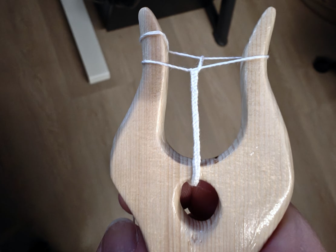 Nyörihaarukalla tehdään neliskanttista nyöriä ja sen paksuus on suoraan verrannollinen käytetyn langan paksuuteen. Tein Outlander-asua varten kaksi nyöriä: kureliivien nyörin valkoisesta kalalangasta ja yläosan nyörin ruskeasta merinovillalangasta.