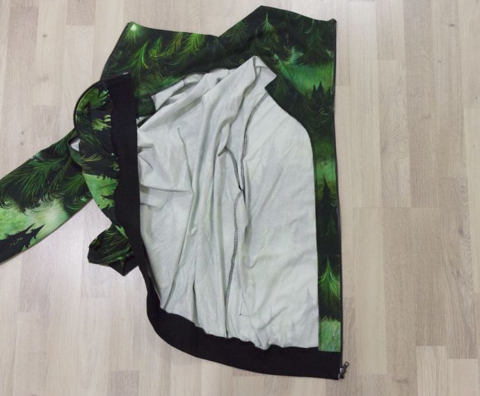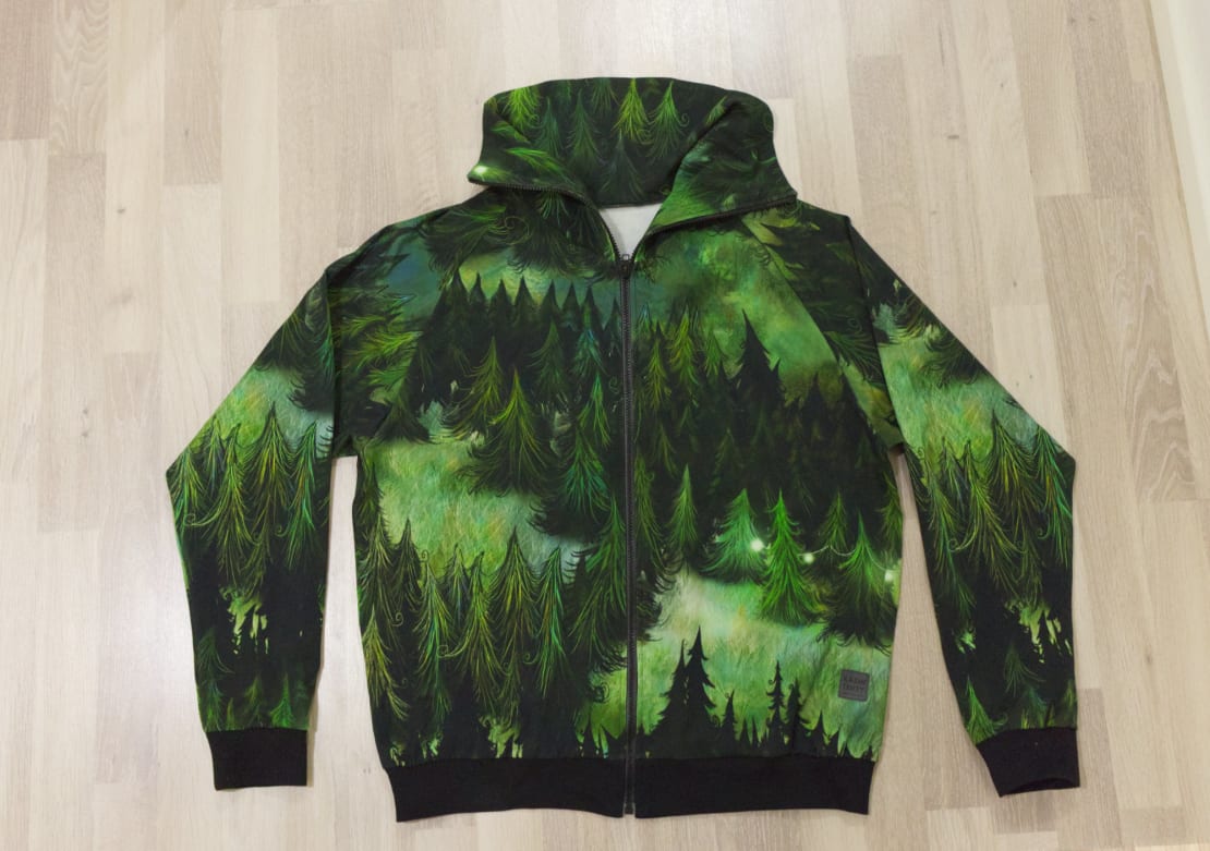 Kangas on Ommellisen Kuusien kuiske, josta minulla on itselläni jo aiemmin tehty huppari ja mies tykästyi siihen kuosiin. Nyt meillä ei sitten ole mätsääviä tuulipukuja, mutta hupparit on!