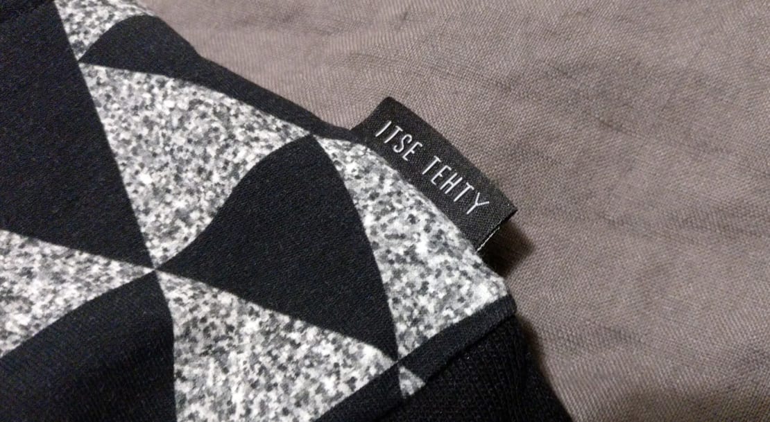 Tilasin vihdoin ompelumerkkejä omalla tekstillä, jotta voin merkata tekemäni vaatteet ja muut ompelukset. Toisella puolella lukee Itse tehty ja toisella puolella Nova. Merkki on 30mm leveä ja 12mm korkea 7mm ompeluvaralla.