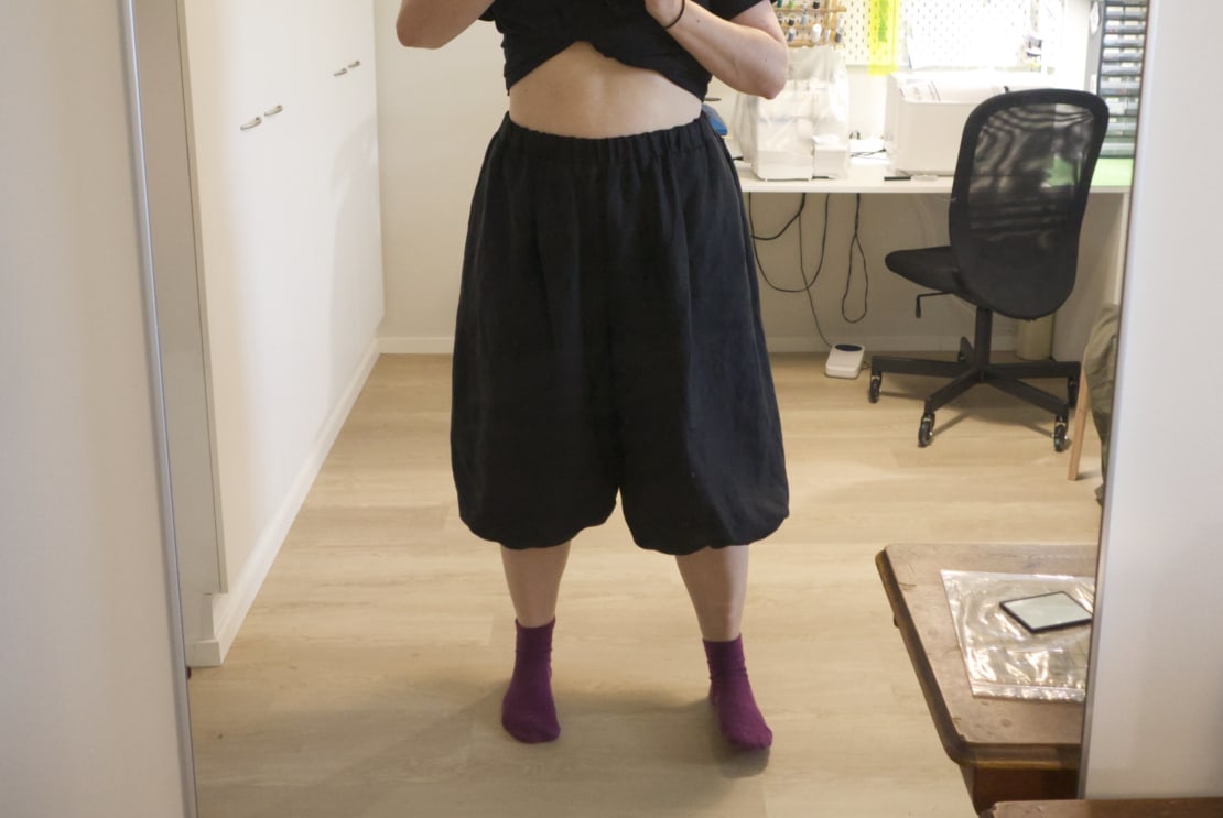 Varsinaiset housut tein mustasta pellavasta. Sivusaumat, taskupussi ja haarakoukku on ommeltu pussisaumoilla. Kaavan ohjeiden mukaan vyötärönauha ommellaan ensin oikealta puolelta, sitten taitetaan puoliksi ja vedetään 6mm yli edellisen sauman, jotta sen voi ommella päältä päin stitch-in-the-ditch tyyliin. Kokeilin tätä, mutta en tykännyt miltä vyötärönauha näytti kun saumavarat on käännetty ylöspäin sen sisälle, niin purin sen ja ompelin yhteen tavalliseen tapaan ja huolittelin reunat saumurilla.