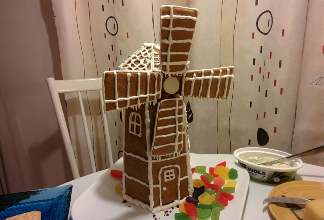 Viime vuonna emme tehneet piparkakkutaloa, koska emme viettäneet koko joulua. Pakenimme sen sijaan Karibialle. Tänä vuonna emme keksineet mitään kovin jännittävää, joten teimme tuulimyllyn.