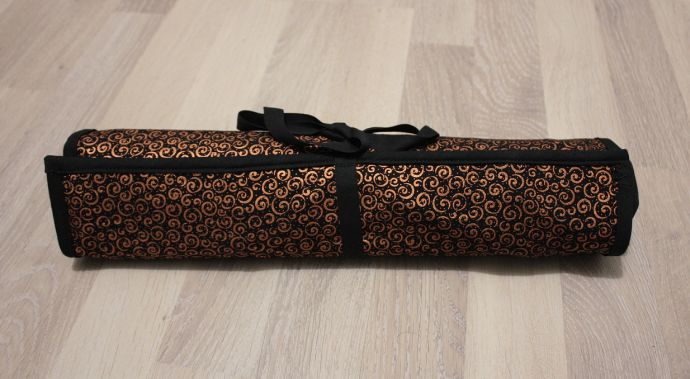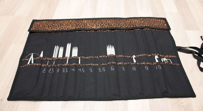 Rullan yläreunassa on läppä, joka estää puikkojen putoamisen kun rulla on kiinni. Reunaan kiinnitin nauhaa, joilla rullan voi sitoa kiinni. Kankaina on käytetty EK:n palalaarin kuparin väristä kuviopuuvillaa ja mustaa puuvillaa. Rullan reunoissa on mustaa vinonauhaa, ja kerroksien reunoissa kuviopuuvillasta tehtyä nauhaa.