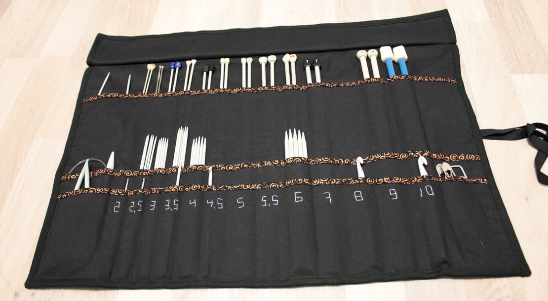 Kyllästyin siihen, että sukkapuikot ja koukut olivat sikin sokin laatikossani. Tein niille pussin, tai oikeastaan rullan, jossa on kujat jokaiselle koolle numeroituna. En tosin ole kovin hyvä ompelemaan käsin, joten numerot ovat vähän vinksahtaneita.