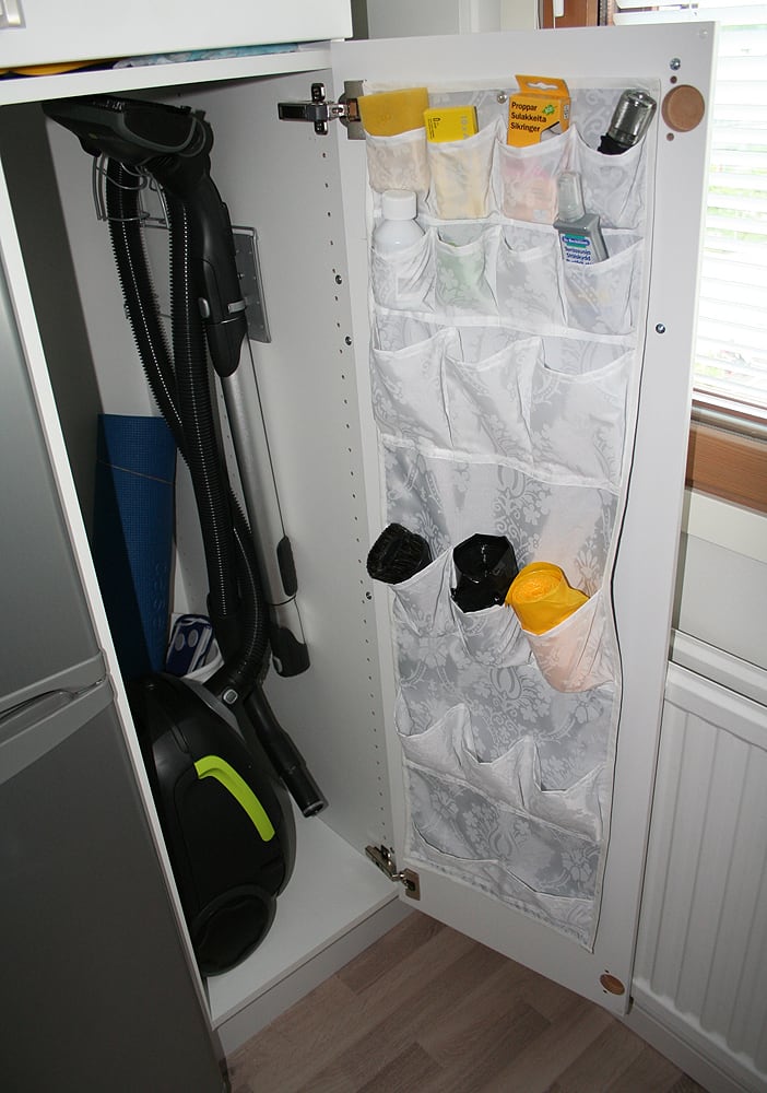 Yksiössä ei ole koskaan tarpeeksi säilytystilaa, jotein tein vanhasta suihkuverhosta ripustettavan lokerikon siivouskaapin oveen. Lokerossa säilytin kaikenlaista kodintavaa sulakkeista, pesusienistä aina imurin suuttimiin asti.