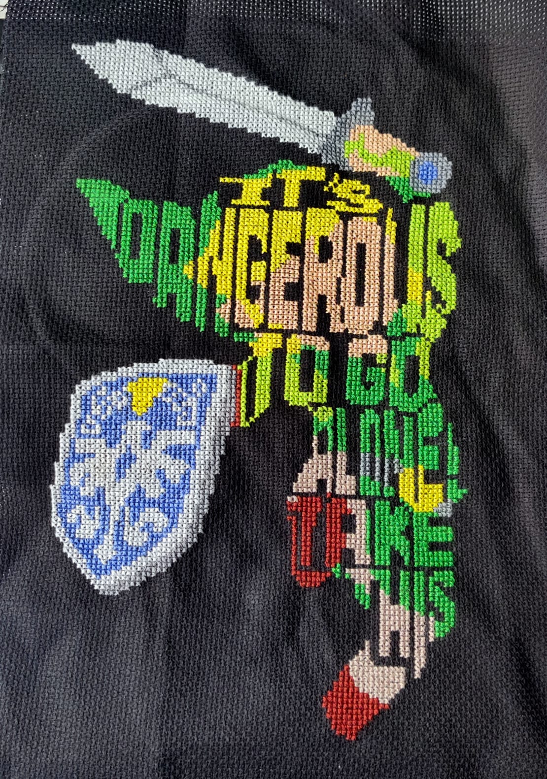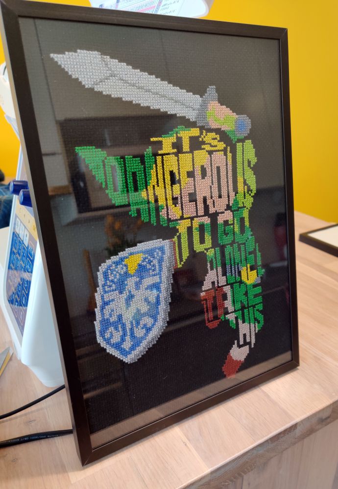 Link on kirjottu mustalle 14-koon aidakankaalle. Musta aida oli minulle uusi tuttavuus ja se muuttaa kyllä ihan kokonaan työn ilmettä. Taidan seuraavaksi kokeilla mustalle pohjalle pelkällä valkoisella jotain kuviota.
