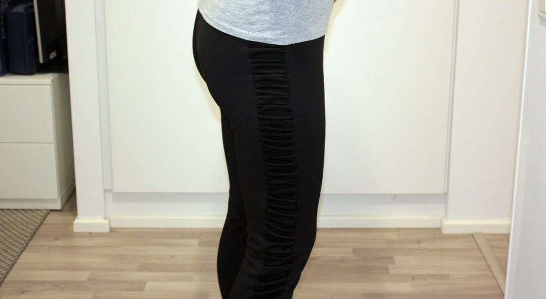 Kaavana käytin itse piirtämiäni leggingsien kaavoja (Mallikelpoinen). Leikkasin kaavan keskeltä, eli jalan ulkosivulta n. 6cm leveän suikaleen pois. Tuplasin suikalekaavan pituuden ja ompelin poimutuslangat suikaleiden molemmille reunoille. Poimutin suikaleet käsin kaavan korkuisiksi ja ompelin kiinni etu- ja takakappaleisiin. Loput ompelin normaaliin tapaan, eli ensin sisäsaumat ja lopuksi toinen lahje toisen sisään ja haarasauman ompelu. Vyötäröllä on leveä kuminauha, jonka löysin jostain ompeluvarastoni syövereistä.