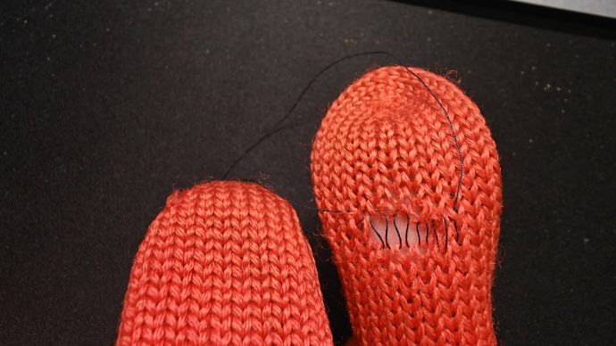 Samalla vilkaisin toisen käden peukaloa, ja huomasin, että sekin oli hiutumassa puhki. Päätin parsia senkin tässä vaiheessa, koska se on niin paljon helpompaa kun voi vielä vahvistaa olemassaolevia silmukoita.