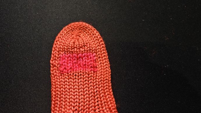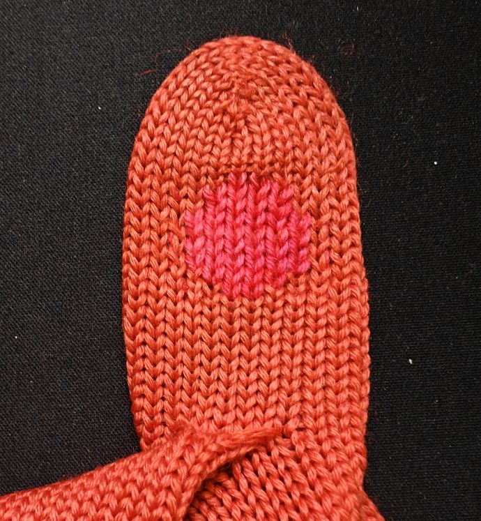 Toinen peukku onnistui paljon paremmin. Tässä kokeilin vähän pyöreämpää muotoa, jotta kaikki paine ei kohdistuisi samalle riville. Lieneekö ehjä neulos myös auttanut saamaan tasaisemman langankireyden.