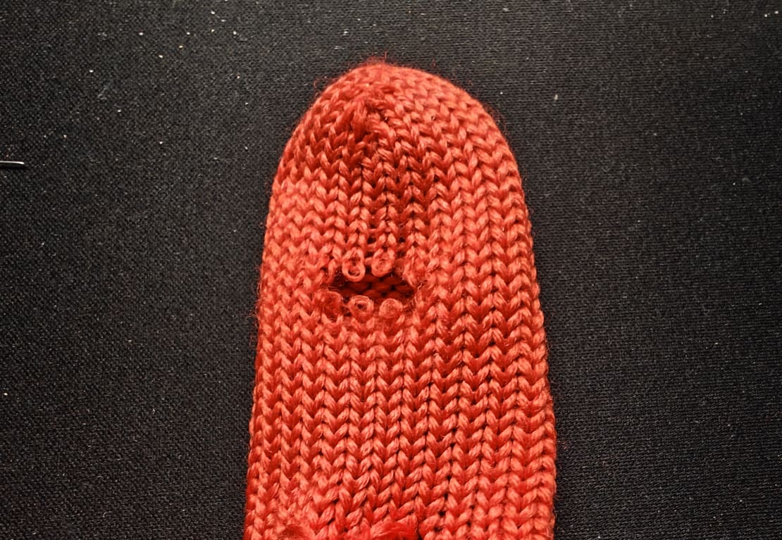 Sitten silmukoin neulalla ja langalla puuttuvat silmukat apulankoja käyttäen. Minulla ei ollut oranssia lankaa, eikä puolisolle värillä ollut väliä, joten käytin punaista. Pääasia on, että ne saa korjattua.