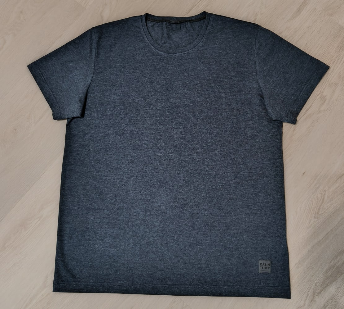 Puoliso toivoi t-paitaa joululahjaksi. Käytiin Eurokankaassa ja puoliso sai itse valita mieluisan kankaan. Hän valitsi tummansinisen meleeratun trikoon.