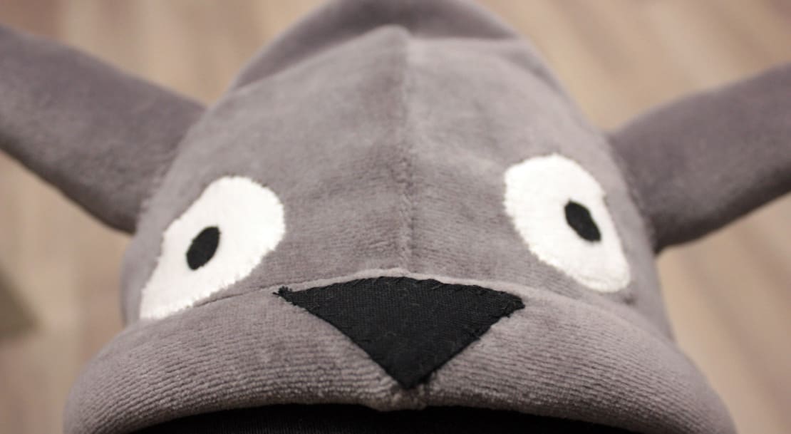 Jouduin laittamaan vetoketjun selkäpuolelle, koska en halunnut vetoketjun rikkovan etupuolen mallia. Ja takavetoketju taas meinasi, että hupusta pitäisi tehdä irroitettava. Käytin neppareita hupun ja hännän kiinnitykseen. Häntä on täytetty vanulla ja kiinnittyy takapuoleen neppareilla. Hupun korvat on myös täytetty vanulla.