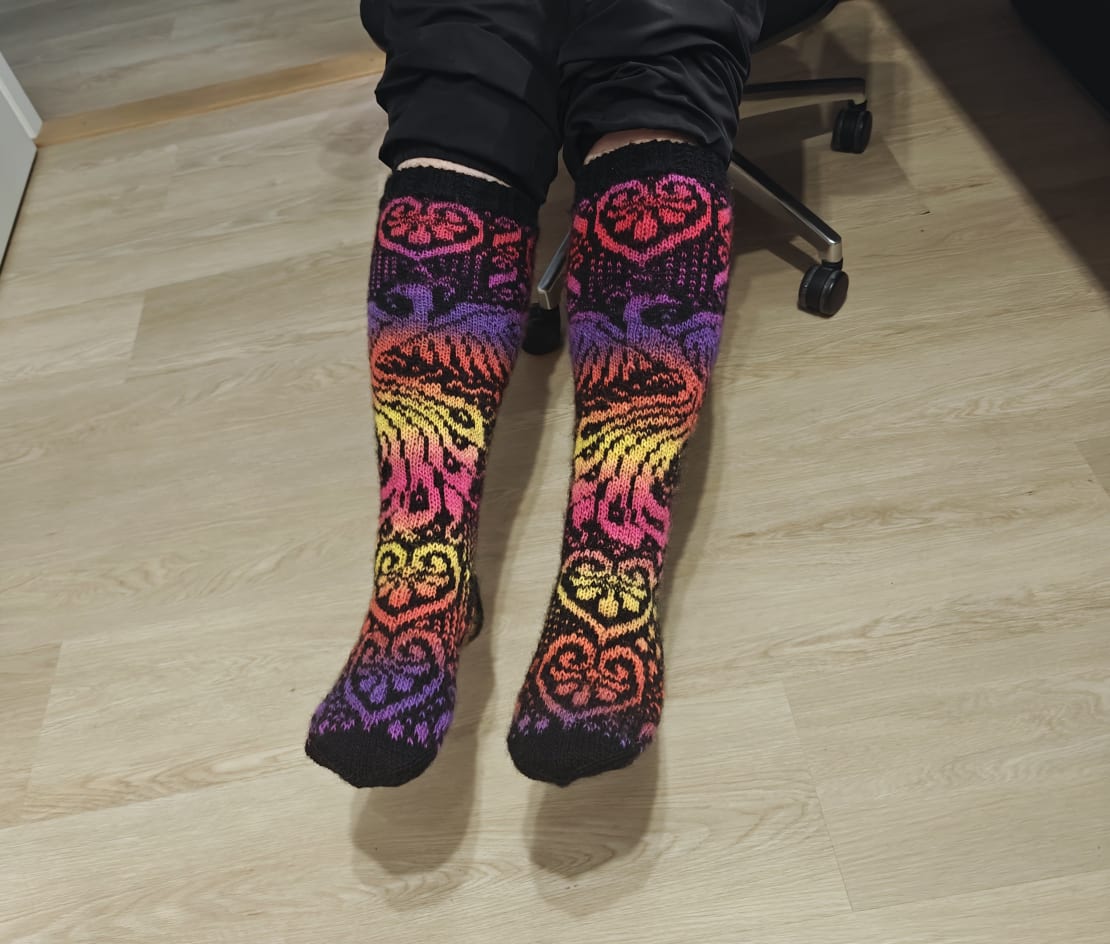 Edistin toista sukkaa aina silloin tällöin ja sain sen valmiiksi lokakuussa 2025. Tein tietoisesti toisesta sukasta vähän löysemmän pohkeen kohdalta, koska ensimmäinen oli napakka. Se varmaan selittää värieron, vaikka yritin aloittaa sukan samasta kohtaa liukuväriä. Värit osuvat suurin piirtein kohdalleen aina nilkkaan asti, jonka jälkeen ne lähtevät eri teille.