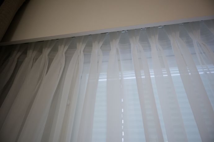 Käytin Anja Pesolan kruunulaskosnauhaa, jonka rypytyssuhde on 1:2,5. Se tarkoitti 7m kangasta tälle ikkunaseinälle. Kruunulaskoksessa on kolme taitetta vähän kuin W-kirjaimen muodossa.