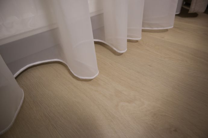 Kangas on tuplaleveää luonnonvalkoista Marelle-voileeta Eurokankaasta. Kankaassa on toisessa reunassa jo valmiiksi lyijynauha, jonka jätin alareunaan tuomaan vähän painoa.