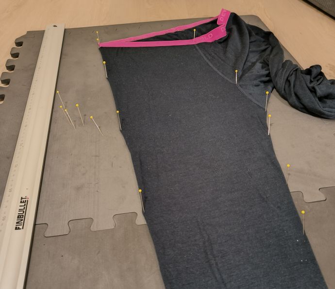 Kopioin kaavat olemassaolevasta kerrastostani pingottamalla vaatteen nuppineulojen avulla. Tein pingotuksen hihojen ja lahkeiden osalta etu- ja takapuoli erikseen, yrittäen suoristaa vaatteen mahdollisimman tasaisesti. Lopuksi yhdistin puolikkaat paperilla kokonaiseksi osaksi. Paidan etu- ja takaosat sain piirrettyä yhdellä kertaa.